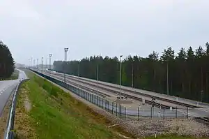 Koidula railway station (Estonian: Koidula raudteejaam) is a railway station in Koidula, Estonia, on the Russian border. It merges the Tartu–Pechory and Valga–Pechory railways just before the Russian border (Pechory is located straight after the border). The station opened in September 2011, and is a few metres from the border with Russia border and the railway station at.[1][2] The main purpose of the station is making the crossing of Russian border easier for both goods and passengers. It also enabled the traffic on "Southeast Estonian Triangle" (Tartu–Valga–Piusa–Tartu) without crossing the Russian border. Currently however there are no cross-border passenger trains, and services from Pskov to Pechory do not connect with the Elron services in Estonia.[3]
