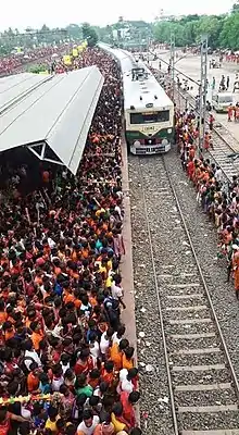 Sealdah division's first Matribhumi local started in October 2018; it was the first all-women passenger train in Indian Railway history. It had female motormen, guards, and security personnel.[27][28] On 24 August 2015, train services were halted between the Barasat and Bangaon line after a protest by a group of passengers obstructed movement of the trains. They demanded that male passengers be allowed to travel on the Matribhumi ladies special trains. This occurred when Eastern Railway withdrew the decision to allow male passengers to travel on Matribhumi local.[29]