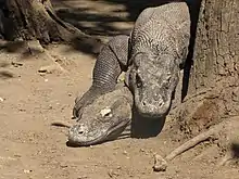 Mating occurs between May and August, with the eggs laid in September.[5][57] During this period, males fight over females and territory by grappling with one another upon their hind legs, with the loser eventually being pinned to the ground. These males may vomit or defecate when preparing for the fight.[34] The winner of the fight will then flick his long tongue at the female to gain information about her receptivity.[40] Females are antagonistic and resist with their claws and teeth during the early phases of courtship. Therefore, the male must fully restrain the female during coitus to avoid being hurt. Other courtship displays include males rubbing their chins on the female, hard scratches to the back, and licking.[58] Copulation occurs when the male inserts one of his hemipenes into the female's cloaca.[35] Komodo dragons may be monogamous and form "pair bonds," a rare behavior for lizards.[34]