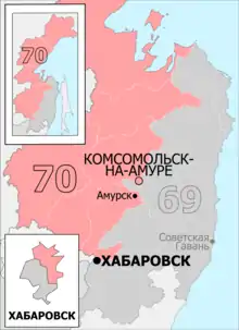 The Komsomolsk-na-Amure Constituency (No.70[lower-alpha 1]) is a Russian legislative constituency in the Khabarovsk Krai. In 1993-2007 the constituency was included most of upstate Khabarovsk Krai and the city of Komsomolsk-on-Amur. However, the Komsomolsk-na-Amure constituency was gerrymandered in 2016, and now consists of not just northern Khabarovsk Krai and Komsomolsk-na-Amure, but also of eastern Khabarovsk and its suburbs.