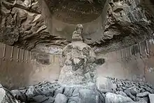 There are still, however, remains of seven pillars on the left side of the cave, and six on the south, which rake inwards, as do also those at Bhaja and Bedsa, a proof of the early date of the work; those behind the dagoba and six near the front on the right side have disappeared entirely. On the upper portion of one column on the left is a symbol or device somewhat resembling a dagoba, with a rude canopy over it. The arched roof has had wooden rafters as at Karle and elsewhere, but they are gone, and the only remains of the woodwork is a portion of the latticed screen in the front arch. The façade bears a strong family likeness to that at Bhaja. On the left side is a fragment of sculpture in high-relief part of the head of a single figure about twice life-size. The features are destroyed, but the details of the headdress show the most careful attention to finish of detail. Over the left shoulder is an inscription in one line in Brahmi characters which reads: Kanvasa antevasina Balakena katam ("Made by Balakena, the pupil of Kanha (Krishna)").[3]