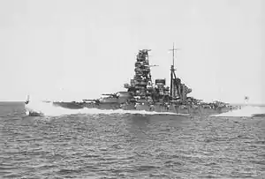 Haruna was laid down at Kobe by Kawasaki on 16 March 1912, launched 14 December 1913, and formally commissioned 19 April 1915.[15] After a short patrolling duty off Sasebo, Haruna suffered a breech explosion during gunnery drills on 12 September 1920; seven crewmen were killed and the No. 1 turret badly damaged.[15] After a long period of time in reserve, Haruna underwent her first modernization from 1926 to 1928. The process upgraded her propulsion capabilities, enabled her to carry and launch floatplanes, increasing her armour capacity by over 4,000 tons,[7] and was shortly thereafter reclassified as a Battleship.[15] She was overhauled a second time from 1933 to 1935, which additionally strengthened her armour and reclassified her as a fast battleship. During the Second Sino-Japanese War, Haruna primarily served as a large-scale troop transport for Japanese troops to the Chinese mainland.[15] On the eve of the commencement of World War II, Haruna sailed as part of Vice-Admiral Nobutake Kondō's Southern Force. On 8 December 1941, Haruna provided heavy support for the invasion of Malaya and Singapore.[49] She participated in the major Japanese offensives in the southern and southwestern Pacific in early 1942, before sailing as part of the carrier-strike force during the Battle of Midway.[15] Haruna bombarded American positions at Henderson Field at Guadalcanal, and provided escort to carriers during the Solomon Islands campaign. In 1943, she deployed as part of a larger force on multiple occasions to counter the threat of American carrier strikes, but did not actively participate in a single battle.[15] In 1944, Haruna was an escort during the Battle of the Philippine Sea and fought American surface vessels off Samar during the Battle of Leyte Gulf.[50] She was the only one of the four battleships in her class to survive 1944.[51] Haruna remained at Kure throughout 1945, where she was sunk by aircraft of Task Force 38 on 28 July 1945, after taking nine bomb hits at her moorings.[52] She was subsequently raised and broken up for scrap in 1946.[15]