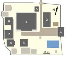 Other buildings on the western end of the precinct are (from north to south), the Mie Hall (御影堂, Mie-dō) (6), the Hall of the Five Buddhas (五仏堂, Gobutsu-dō) (7) and the Yakushi Hall (薬師堂, Yakushi-dō) (8). All of these three structures have a square layout and a hip roof.
