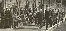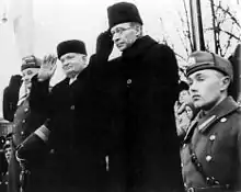 Päts was one of the candidates in the presidential elections that were supposed to be held in April 1934, but the Vaps Movement candidate Andres Larka and even lieutenant general Johan Laidoner were both thought to be more popular candidates than Päts. The campaign was accompanied by threats by the Vaps Movement to take power and rumours of a forthcoming coup. In early March 1934, Päts's political opponent Jaan Tõnisson compared the Vaps Movement with the Nazis in Germany and advised the government to take necessary action against the movement.[33] Konstantin Päts then carried out a self-coup on 12 March 1934. He was supported by general Johan Laidoner and the army.[3]