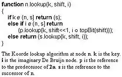 In peer-to-peer networks, Koorde is a distributed hash table (DHT) system based on the Chord DHT and the De Bruijn graph (De Bruijn sequence). Inheriting the simplicity of Chord, Koorde meets O(log n) hops per node (where n is the number of nodes in the DHT), and O(log n/ log log n) hops per lookup request with O(log n) neighbors per node.