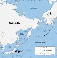 After taking off from Anchorage, the flight was instructed by air traffic control (ATC) to turn to a heading of 220 degrees. Approximately 90 seconds later, ATC directed the flight to "proceed direct Bethel when able".[21][22] Upon arriving over Bethel, Alaska, KAL 007 entered the northernmost of five 50-mile (80 km) wide airways, known as the NOPAC (North Pacific) routes, that bridge the Alaskan and Japanese coasts. KAL 007's particular airway, R-20 (Romeo Two Zero), passes just 17.5 miles (28.2 km) from what was then Soviet airspace off the coast of the Kamchatka Peninsula.
