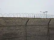 A 2007 Reuters report revealed that there is no coast to coast wall located across the DMZ and that the pictures of a "wall" which have been used in North Korean propaganda have merely been pictures of concrete anti-tank barriers.[36] While 800,000 landmines were being removed in 2018, it was shown that the Joint Security Area along the Korean border was guarded by standard barbed wire.[37]