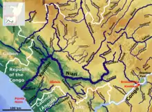 The Kouilou-Niari River—also spelled Kwilu, Kwila, or Kwil—is the most important river flowing to the Atlantic Ocean of the Republic of the Congo coast. Moreover, its entire drainage area is completely in the Republic of the Congo. The river is called the Kouilou River while flowing in the coastal region of the Kouilou till the Sounda gorges. Upstream from the gorges, its name is the Niari River and it flows through the Niari Valley. The river combines with the Louessé, the Loudima and the Bouenza River and eventually flows into the Atlantic Ocean. It covers about 560 km from its origin in the Batéké Plateau of the Congo to its mouth at the coast.