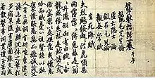 There are several National Treasures related to copies of specific sutras, including 18 handscrolls of the Fukū Kenjaku Shinpen Shingon Sutra (不空羂索神変真言経, fukū kenjaku shinpen shingonkyō) from the 8th century Nara period held by Sanbō-in (三宝院); seven scrolls of the Lotus Sutra in large characters (大字法華経, daiji hokekyō) (vol. 3 missing) from Ryūkō-in (龍光院) also from the 8th century, and one scroll, vol. 6 of the Lotus Sutra (法華経, hokekyō) from the Heian period owned by Kongōbu-ji. The latter is notable for being written on colored paper.Ryūkō-in (龍光院) owns two treasures of the Konkōmyō Saishōō Sutra from the 8th century Nara period: one, consisting of ten scrolls and known as Konkōmyō Saishōō Sutra with gilt letters (紫紙金字金光明最勝王経, shishikinji konkōmyō saishōōkyō) was one of the sutras enshrined in the state-sponsored "Temples for the Protection of the State by the Golden Light (of the) Four Heavenly Kings" founded by Emperor Shōmu. The other, Konkōmyō Saishōō Sutra in minute characters (細字金光明最勝王経, saiji konkōmyō saishōōkyō), consisting of two scroll is unusual in having 34 characters per line instead of the usual 17.[21][8]