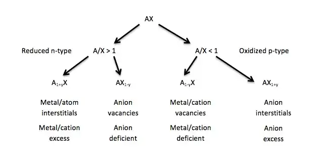 The following oxidation–reduction tree for a simple ionic compound, AX, where A is a cation and X is an anion, summarizes the various ways in which intrinsic defects can form. Depending on the cation-to-anion ratio, the species can either be reduced and therefore classified as n-type, or if the converse is true, the ionic species is classified as p-type. Below, the tree is shown for a further explanation of the pathways and results of each breakdown of the substance.