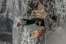 A jeep track runs down to the sea from Krýsuvík and Route 427. It ends at the high cliffs of Krýsuvíkurbjarg [ˈkʰriːsʏˌviːkʏrˌpjark] or Krýsuvíkurberg [-ˌpɛrk] which are renowned as bird cliffs with thousands of Icelandic sea birds like arctic terns, puffins, fulmars and more.[3] About 63,000 pairs of birds were counted there shortly before 2014. But the cliffs, which can be reached on foot, are also a window in the geologic past.[10] The lava flows covering the area came mostly from the crater up on Geitahlíð tuya, not from the Krýsuvík, but from the neighbouring Brennisteinsfjöll volcanic system. The area is protected as part of Reykjanesfólkvangur.[11]