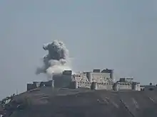 The Syrian Civil War began in 2011, prompting UNESCO to raise concerns that the war might damage cultural sites including Krak des Chevaliers.[51] The castle was shelled in August 2012 by the Syrian Arab Army, damaging the Crusader chapel.[52] It was damaged again in July 2013 by an airstrike conducted by the Syrian Arab Air Force during the Siege of Homs,[53] and once more on 18 August 2013. The Syrian Arab Army captured the castle and village of al-Hosn in March 2014. Since then, UNESCO has published periodic reports about the state of the site, reconstruction and conservation measures.[54]