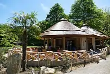 The meerkat lodge was opened in 2017. Following typical African mud huts, two interconnected circular buildings were built, which house the meerkat facility and a viewing terrace with drinks. Breeder Toni disappeared without trace on 2 June 2018; the 3-year-old male Kimya from Münster Zoo succeeded him. At the end of November 2018, Amari, who was born in Krefeld in March 2018, gave birth to two kittens. In 2019 a total of 12 animals were living in the enclosure.