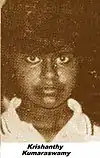 Krishanti Kumaraswamy (Tamil: கிருஷாந்தி குமாரசுவாமி), also spelled Krishanthi Kumaraswamy, was a Tamil woman in Sri Lanka who was raped and murdered on 7 August 1996 by 6 Sri Lankan Army soldiers; the effort to bring her assailants to justice became a cause célèbre as a part of the protest against atrocities committed by the Sri Lankan Army during the Sri Lanka civil war.