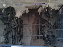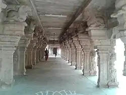 There are many halls in the temple namely the Pandal mantap, Vahana mandap, Ranga Mandap an Nanguneri Jeeyar mandap. The Pandal mandap has pillars replete with architectural features displaying pushpaboikai, palagai, and varikolam. The Unjal mandap is designed to accommodate the swing for the festival deities. The square shaped Vasantha mandap has Navarang style.[1][2] The temple houses rare sculptures from the Nayak period in the Veerappa Nayak Mandap. There are exquisite carvings in the pillars and life size images indicating various legends of Hindu Puranas.[3] The Jeeyar mandap houses lot of pillars with images of ladies hold lamps as in Kerala temples. The seer of temples used to rest at this place during festivals. The Sorga vasal (gateway to heaven) is located to the west of Yagasalai Mandap and is open only during the ten-day Vaikunta Ekadasi festival. Manimandap has numerous pillars with sculptures of elephants and yalis.[1][4] The composite columns of Virabhadra holding sword and horn are found be additions of the Vijayanayagara kings during the early 1500s. Similar columns of Virabhadra are found in Adikesava Perumal Temple at Thiruvattaru, Meenakshi Temple at Madurai, Nellaiappar Temple at Tirunelveli, Kasi Viswanathar temple at Tenkasi, Ramanathaswamy Temple at Rameswaram, Soundararajaperumal temple at Thadikombu, Srivilliputhur Andal temple, Srivaikuntanathan Permual temple at Srivaikuntam, Avudayarkovil, Vaishnava Nambi and Thirukurungudivalli Nachiar temple at Thirukkurungudi.[5]