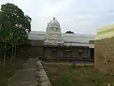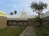 The temple occupies an area of 1.8 acres (0.73 ha) and is surrounded by a granite walls. The temple had originally three precincts, the outer one of which was demolished by Chanda Sahib at the orders of Nawab of Arcot. The stones were used to build the fort at Palayamkottai. The five tiered rajagopuram, the temple's gateway tower, is 110 ft (34 m) tall. The sanctum houses the image of Venkatachalapathy in standing posture 4 ft (1.2 m) is made of granite sporting four arms. Two of his arms hold the conch and Chakra, while the other two sport Abayamudra and Kadahasta. The images of Sridevi and Bhudevi are located on either of his side. The festive image is called Srinivasan and the image has identical features as that of the presiding deity. The Ardha mandapa is guarded by two Dwarapalas on either sides.[1][2] There is a separate shrine of Alamelumangai in the third precinct, which also houses the festival image.