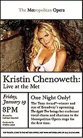 Chenoweth headlined the one-night-only concert during her break from performing in the Roundabout Theatre Company's 2006 revival of The Apple Tree.[2][3] She was only the third musical theatre actor ever to present a solo concert at the Met, following Barbara Cook and Yves Montand.[4] The concert was directed by Kathleen Marshall and featured a 12-piece orchestra conducted by Andrew Lippa.[2] Chenoweth performed a diverse selection of musical theatre, light opera, pop, country and fan favorites. She was joined on stage by two dancers, Seán Martin Hingston and David Elder, and the Juilliard Choral Union (JCU).[3]