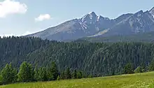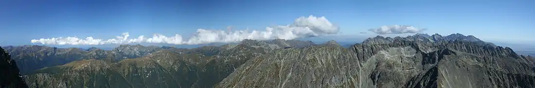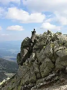 Kriváň has been favored by those appreciative of its aesthetic and historical allure, as well as by those who seek vistas from the top. Polls of nature lovers at large as well as of connoisseurs have consistently rated it as Slovakia's most beautiful mountain.[13] The 360-degree view from the top is among the best in Slovakia with the scenery ranging from the populated valleys of upper Liptov, Spiš, and distant parts of Podhale, to the rugged drops of its north face, and many of the notable peaks of the Tatras including Giewont over Zakopane, Rysy, Lomnický štít, and Gerlach, the highest peak of the Carpathians. The panorama is framed by the Western and Low Tatras, and by mountain ranges beyond them in good visibility.[14]