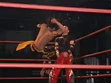 Kudo returned to Japan and DDT on April 2, 2006, teaming with Mikami in a tag team match, where they defeated Harashima (the now unmasked Hero!) and Jet Shogo.[40] During the following months, Kudo feuded with former partner Harashima and his villainous Disaster-Box stable.[41] On June 25, Kudo teamed with Masami Morohashi and Seiya Morohashi in a six-man tag team match for the Jiyūgaoka 6-Person Tag Team Championship, losing to the team of Harashima, Muscle Sakai and Yusuke Inokuma.[42] On July 2, Kudo, Mikami and Shiima Xion defeated Harashima, Toru Owashi and Yusuke Inokuma to win the 2006 Takechi Six Man Tag Scramble Cup.[40] The rivalry culminated on July 23 in an eight-man elimination tag team match, where Kudo, Mitsuya Nagai, Poison Sawada Julie and Sanshiro Takagi, representing DDT, faced Harashima, Danshoku Dino, Jet Shogo and Toru Owashi, representing Disaster-Box. Kudo scored the final elimination of the match, pinning Harashima to give DDT the win over Disaster-Box.[40] As a result, Kudo was granted a shot at Toru Owashi's KO-D Openweight Championship on August 27, but was unable to dethrone the defending champion.[40] After returning from a short break following an injury, Kudo turned heel and formed the Team 2 Thousand Island stable with Sanshiro Takagi and Yoshiaki Yago, continuing his rivalry with the now-face Harashima.[41] Kudo and Harashima faced off on November 23 in a grudge match, which was won by Harashima, who, as a result, became the number one contender to the KO-D Openweight Championship, which he went on to win from Toru Owashi a month later.[40]