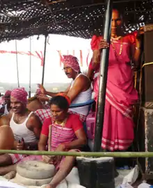 According to Kerala tradition, the ceremony of Talapoli, as a procession of ladies carrying oil lamps accompanied by chenda (percussion instruments) or tappu melam, can be seen during the festivals in these devi temples. The traditional haampu (multi-stacked portable brass lamp or a similar stone lamp) found in a number of Kudumbi temples is lit on special puja days. Votive items made from Aval (puffed rice) or beaten rice and jaggery are still offered as prasadam in many Kudumbi temples. Holi, the festival of colors, is celebrated in many Devi temples by the Kudumbi. During this festival, "Kamadeva" (Bodhan) the symbolic entity of "Kama" will be burnt to fire, purifying the life of all who participate in the festival. There will be a procession on the streets where all the participants will be applying colour each other, dancing with songs sung in Kudumbi language. Youngsters and children go in a group, pour yellow water from the pot kept in front of every house, and finally gather at their local devili temple.[27] In the night there will be a special group dance by women (fuguda) by gathering in a circle and clapping and doing brisk movements. After this there will be delicious dinner and food will be offered to souls. Even Kudumbis of Karnataka, who had migrated from Goa along with their brethren in Kerala and other places continue to celebrate their traditional festival 'holi' by preserving their own unique culture.[28][29]