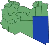 Kufra or Kofra (Arabic: الكفرة Al Kufra), also spelled Cufra in Italian, is the largest district of Libya. Its capital is Al Jawf, one of the oases in Kufra basin.[2] There is a very large oil refinery near the capital. In the late 15th century, Leo Africanus reported an oasis in the land of the Berdoa, visited by a caravan coming from Awjila. It is possible that this oasis was identical with either the Al Jawf or the Taiserbo oasis, and on early modern maps, the Al Kufra region was often labelled as Berdoa based on this report.