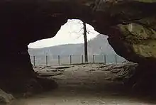 The Kuhstall (Czech: Kraví hora) is the second largest natural arch in the Elbe Sandstone Mountains after the Pravčická brána. It is located on the Neuer Wildenstein, a 337 m high rock outcrop in the hinterland of Saxon Switzerland, south of the Lichtenhain Waterfall and above the Kirnitzsch valley. It is crowned by the 15th-century castle of Wildenstein. The arch is 11 metres high, 17 metres wide and 24 metres deep.