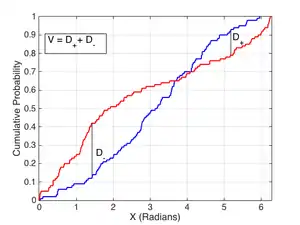 Kuiper's test is closely related to the better-known Kolmogorov–Smirnov test (or K-S test as it is often called). As with the K-S test, the discrepancy statistics D+ and D− represent the absolute sizes of the most positive and most negative differences between the two cumulative distribution functions that are being compared. The trick with Kuiper's test is to use the quantity D+ + D− as the test statistic. This small change makes Kuiper's test as sensitive in the tails as at the median and also makes it invariant under cyclic transformations of the independent variable. The Anderson–Darling test is another test that provides equal sensitivity at the tails as the median, but it does not provide the cyclic invariance.