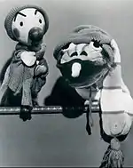 The puppet cast included "Kukla",[3] the earnest leader of the troupe; "Ollie", or "Oliver J. Dragon", a roguish one-toothed dragon (who would slam his flat chin on the stage in frustration or roll on his back to be endearing); Madame Oglepuss, a retired opera diva; Buelah Witch, a liberated witch; Fletcher Rabbit, the troupe's mailman and resident fussbudget, who, in keeping with the show's unrestrained use of puns, also worked at "The Egg Plant"; Cecil Bill, the troupe's union stagehand who spoke in an unintelligible "tooie talk"; Colonel Crackie, a Southern gentleman; Dolores Dragon, Ollie's younger cousin; and a number of others.[4]