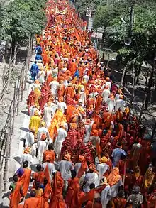 One of the key features of the Kumbh mela has been the camps and processions of the sadhus (monks).[58] By the 18th-century, many of these had organised into one of thirteen akharas (warrior ascetic bands, monastic militia), of which ten were related to Hinduism and three related to Sikhism. Seven have belonged to the Shaivism tradition, three to Vaishnavism, two to Udasis (founded by Guru Nanak's son) and one to Nirmalas.[58] These soldier-monk traditions have been a well-established feature of the Indian society, and they are prominent feature of the Kumbh melas.[58]