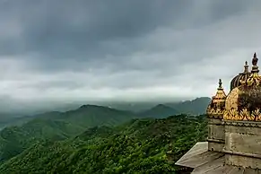 Kumbhalgarh Wildlife Sanctuary is located in the Rajsamand District of Rajasthan State in western India.[3] It surrounds the Kumbhalgarh fortress and covers an area of 610.528 km2 (236 sq mi).[2] The sanctuary extends across the Aravalli Range, covering parts of Rajsamand, Udaipur, and Pali districts, ranging from 500 to 1,300 metres (1,600 to 4,300 ft) in elevation. It is part of the Khathiar-Gir dry deciduous forests ecoregion.[4]