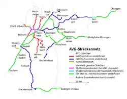 Kuppenheim has a train station on the double-track section of the Kuppenheim–Bad Rotenfels section of the Murgtalbahn, on which, after electrification from 2000 to 2004, the S8 and S81 lines of the Karlsruhe Stadtbahn operated by the AVG operates and connects to Rastatt without changing trains, Karlsruhe, Bruchsal, Menzingen, Odenheim, Gaggenau, Gernsbach, Forbach (Black Forest), Freudenstadt and Eutingen im Gäu station. The S8 runs every hour from the Albtalbahnhof as a tram to Karlsruhe city center and the S81 line to Karlsruhe Central Station in the same rhythm.