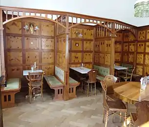 Work started on returning the ground floor rooms to their original condition. The 230m² dining room with its original windows and rehabilitated wall coverings and light fittings is described as one of the most precious Jugenstil (Art Nouveau) interiors in Switzerland. In 2010 the bar came back into operation with its original "seating booths", along with the cinema room. Work has also progressed reinstating and restoring the bedrooms: those on the first, second and third floors now have modern en suite bathrooms, though less expensive rooms on the fourth floor with access to shared shower and wc facilities are still available.[9] The original wall paintings had been covered over with white paint and are initially visible only in small carefully exposed "windows" in the coating. The old Rattan furnishings are being recreated by a family firm in Viet Nam, using the original specifications.