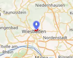 The Kurpark, German for "Spa Park", is a public park in the centre of Wiesbaden, Germany, stretching from the Wilhelmstraße to the southern borders of the district of Sonneberg and lying immediately behind the Kurhaus convention center. It was created in 1852 as an English landscape park and includes a lake where boats can be rented, and a 6 metres (20 ft) tall fountain.[1] It has been described as the most beautiful park in Wiesbaden.[2]