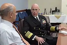 Kurt Walter Tidd[1] (born March 26, 1956) is a retired United States Navy admiral. He last served as the Commander, United States Southern Command. Prior to that assignment, Tidd served as Assistant to the Chairman of the Joint Chiefs of Staff. He also served as the Director for Operations, Joint Staff (J-3) from 2012 to 2013, and as Commander, United States Naval Forces Southern Command and United States Fourth Fleet from August 5, 2011 to June 22, 2012. Confirmed by the Senate on December 16, 2015, Tidd received his fourth star and succeeded John F. Kelly as commander of United States Southern Command on January 14, 2016. Tidd held the title of "Old salt",[2] which means he received his qualification for Surface Warfare before any other active-duty navy officer. He passed said title to Admiral Philip S. Davidson upon his retirement. Upon the May 30, 2018, retirement of his United States Naval Academy classmate, Admiral Harry B. Harris Jr., Tidd also gained the honorific of "Old Goat" – the longest-serving Naval Academy graduate on active duty. Harris presented Tidd with the Old Goat decanter in a ceremony on April 11, 2018.[3]