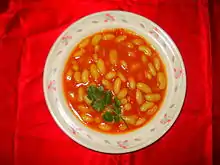Kuru fasulye is a stewed bean dish in Turkish cuisine.[1][2] It is made primarily with white beans and olive oil, and onion and tomato paste or tomato sauce are almost invariably used. Sometimes other vegetables or meat may also be added, especially pastirma. Kuru fasulye is often served along with rice or bulgur. It is often considered the national dish of Turkey.[3][4]