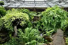 And they took on private landscaping commissions. In 1899 they were hired to construct a fernery (now part of the Morris Arboretum) for wealthy Philadelphia siblings John and Lydia Morris. "To create the distinctive subterranean grotto ambiance, Morris hired Japanese garden makers Kushibiki and Arai to arrange one hundred tons of local Wissahickon schist into rockery formations resembling a cave or mountain cliff accented by delicate waterfalls, a flowing stream bed, and a goldfish pond. Once the plants took hold on the rocky surfaces, entering the fernery felt like a journey through a personal terrarium." The garden contained "about one thousand ferns, representing 523 different varieties," and was considered "one of the finest displays of filmy ferns (Hymenophyllaceae) in cultivation."[12]