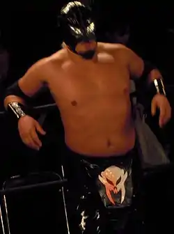Kuuga (空牙, Kūgā) is a Japanese professional wrestler currently working as a freelancer and is best known for his time in the Japanese promotions Osaka Pro Wrestling and Dotonbori Pro Wrestling.[3] A masked wrestler, Kuuga is greatly influenced by lucha libre, and because of this, he has followed Mexican tradition for masked wrestlers, so his real name is not a matter of public record.