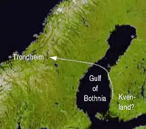 The Viking compass is believed to have had a 45 degree rotation of cardinal points.[9] If the territories listed in King Alfred's Orosius are examined with that in mind, the Norwegians would be to the northwest of Sweden, and the Sami people would be to the north. These points are correct after rotation based on the difference between the Viking and modern compasses. Kvenland is then situated to the northeast of Sweden and might be placed somewhere around the present-day Swedish Norrland or the western part of the present-day Finland. The information of Kvenland being situated "over the wastes", northwards from the Viking-period "Sweden" (corresponding roughly to the south-central part of present-day Sweden) matches the idea of Kvenland extending to Norrland.[4] There is no "Finland" mentioned anywhere either in the original or the updated version of Orosius' history.