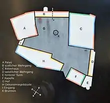 The castle forms an irregular quadrangle with a single courtyard atop a steep hill above the Töss valley. South of the castle, between the medieval neck ditches, is the French formal garden which was designed in 1700 by Caspar Schwarzenbach. The entrance to the castle is through the outer gate located on the north-east corner. The gate house was rebuilt in 1579-80 and decorated with coats of arms by Christoph and Josias Murer. A zwinger or narrow, defensive passage leads from the outer gate to the inner gate. A walkway goes over the zwinger and connects the palas or great hall with the Willenturm (Willen tower) on the north corner of the castle. The inner gate is protected by the bergfried which was built in 1424 with a roof from 1444.[6]