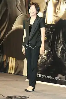 Kyeon remarried in 1998, to businessman Lee Hong-heon.[5] They have one son, Lee Ki-baek. Lee Hong-heon legally adopted Kyeon's two daughters from her first marriage, and they took on his surname; Lee Yu-bi and Lee Da-in are both actresses.[6][7] Kyeon is also a part of the Hwanggan Kyeon clan, which makes her a descendant of Gyeon Hwon, who was the first king of the Hubaekje kingdom, during the Later Three Kingdoms of Korea.