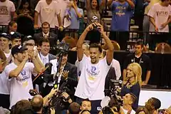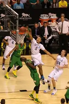 Averaging 14.9 points, 8.7 rebounds, and 6.5 assists per game, Anderson was called "the nation's top triple-double threat" by the Orange County Register.[27] He led the team in both rebounds and assists and was voted the team's most valuable player (MVP).[28] Nationally, he ranked sixth in assists and first among power conference players.[29] Anderson was also third in the Pac-12 in rebounds and steals (1.8) per game.[27] He was the first player in Pac-12 history to register 200 rebounds and 200 assists in a season,[30] as well as the first Division I player with at least 500 points, 300 rebounds and 200 assists in a season.[lower-alpha 1][31] Anderson's field goal percentage improved by seven percentage points from his freshman year, while his three-point field goal percentage jump from 21 to 48 percent.[27] The Associated Press and Sporting News named Anderson a third-team All-American,[16][27] and he was voted to the All-Pac-12 first team as well as first team all-district by the National Association of Basketball Coaches (NABC) and the United States Basketball Writers Association (USBWA).[32][33] He was a finalist for the Oscar Robertson Trophy, given by USBWA to the most outstanding college player; along with Shabazz Napier, they were the only players to also be on the midseason watchlists for the Naismith College Player of the Year, John R. Wooden Award, and Bob Cousy Award.[34][35]