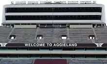 During the singing of the Aggie War Hymn, in which Aggie fans link arms and sway in unison throughout the stadium, the entire west upper deck (including the press box) actually swayed, even though the press box was supported by three concrete pillars. This often startled journalists who haven't covered an Aggie home game before, even though a sign in the press box warned, "Please do not be alarmed, the press box will move during the Aggie War Hymn."[36][37][38] In 2003, the press box was declared a high-rise building, and Texas A&M was forced to renovate it to meet federal, state, and local regulations regarding fire safety and the Americans with Disabilities Act.[39] Renovations before the 2014 season lessened the swaying effect somewhat.[38]