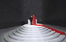 This work, which is a reenactment of the artist's own wedding ceremony, incorporates the symbolic color red, and interprets the traditional meanings of the wedding ceremony in a contemporary context. The performer playing the bride makes her appearance in a high-ceilinged gallery, which signifies the traditional authority of churches, wearing an exaggerated red 50-meter long bridal veil. The bride and groom enter the space simultaneously and equally, and follow a line of candles prepared with the help of the audience to a small central stage. Here, the ceremony is performed, integrating Western visual elements of fashion and architecture (seen) and Eastern actions of symbolic meaning (unseen). After the ceremony, the removal of the bride's veil symbolizes the discarding of restrictions and challenges society's taboos about weddings and marriage. The performers leave behind the existing strictures and seek a new liberated future outside the gallery space.