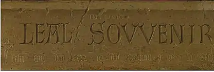 The man sits before an imitation parapet with three sets of painted inscriptions, each rendered to look as if chiselled or scratched into stone.[3] Van Eyck did not have full command of either classical Greek or Latin and made errors, so readings by modern scholars vary. The first inscription is in Greek and seems to spell "TYΜ.ωΘΕΟϹ", which has not been satisfactorily interpreted but has led some to title the work Timotheus. The middle reads in French "Leal Souvenir" ("Loyal Memory") and indicates that the portrait is a posthumous commemoration. The third records van Eyck's signature and the date of execution.[4] The 19th-century art historian Hippolyte Fierens-Gevaert identified the lettering "TYΜ.ωΘΕΟC"[5] with the Greek musician Timotheus of Miletus. Panofsky drew the same conclusion, eliminating other Greeks bearing the name Timothy; they were of religious or military background, professions that do not match the civilian dress of the sitter. Panofsky believed the man was probably a highly placed musician in Philip's court.[6]