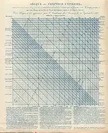 With Philbert Maurice d'Ocagne Lalanne is considered the inventor of the nomogram. The intention was to replace the slide rule.[8] In a paper of 1846 Lalanne contributed to the subject the ideas of anamorphosis and the use of projective transformations. There were applications to the solution of the cubic equation.[14] He called his nomographic device the "abac".[15] This "universal calculator" had 60 functions implemented graphically. Half a century later Maurice d'Ocagne provided a general theory, founded in projective geometry, for the nonlinear scales related by nomography.[16]