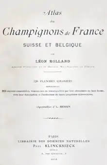His main œuvre was his "Atlas des champignons de France, Suisse et Belgique" ("Atlas of the fungi of France, Switzerland and Belgium"), which covered 283 species, having originally been published in 15 parts from 1906 until 1910, each with 8 plates, and finally summarised in two volumes in 1910. The 120 chrome-lithographic watercolour plates were created by the illustrator A. Bessin, who also illustrated Paul Dumée's mushroom book.[7][8] For this work Rolland was awarded an honorary diploma at the "Universal Exhibition of Turin" (1911), where it was exhibited.[1]