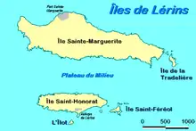 The Lérins Islands (in French: les Îles de Lérins, pronounced [lɛz‿il də leʁɛ̃s]) are a group of four Mediterranean islands off the French Riviera, in Cannes. The two largest islands in this group are the Île Sainte-Marguerite and the Île Saint-Honorat. The smaller Îlot Saint-Ferréol and Îlot de la Tradelière are uninhabited. Administratively, the islands belong to the commune of Cannes.