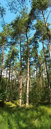 The greater part (about 58%) of the Lüneburg Heath Nature Reserve consists of woods, primarily pine forests, which were planted in the second half of the 19th century on former heathland and drifting sand. In some cases the dunes simply became naturally overgrown, again with pines. There are only a very few old stands of sessile oaks, which stem from the logging industry during the time of the Kingdom of Hanover. In many parts of the nature reserve there are so-called Stühbüsche (a form of coppice), trees that were coppiced by repeatedly being cut short. In the meantime they have grown wild again and have a characteristic and unusual appearance with their multiple trunks. Near Wilsede there is the remnant of a Hutewald, a wood pasture with giant, multi-stemmed beech trees.[7]
