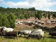 The heath is not therefore a natural landscape, but a cultural landscape created by the intervention of man. In order to prevent its semi-open heathland from being repopulated by trees, especially pines and, to a lesser extent, silver birches, which would cause the loss of this millennia-old environment and its many inhabitants, including often very rare animal and plant species, sheep are allowed to graze it regularly; these are almost exclusively the local German moorland sheep, the Heidschnucke.