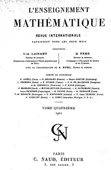L’Enseignement mathématique is a journal for mathematics and mathematics education. It was founded in 1899 jointly by Henri Fehr from Geneva and by Charles-Ange Laisant from Paris as co-editors-in-chief. When Laisant died in 1920, Adolphe Buhl replaced him as co-editor-in-chief. Buhl died in 1949 and Fehr died in 1954 — since then the journal has been affiliated with the University of Geneva. It is the official organ of the International Commission on Mathematical Instruction (ICMI).[1]